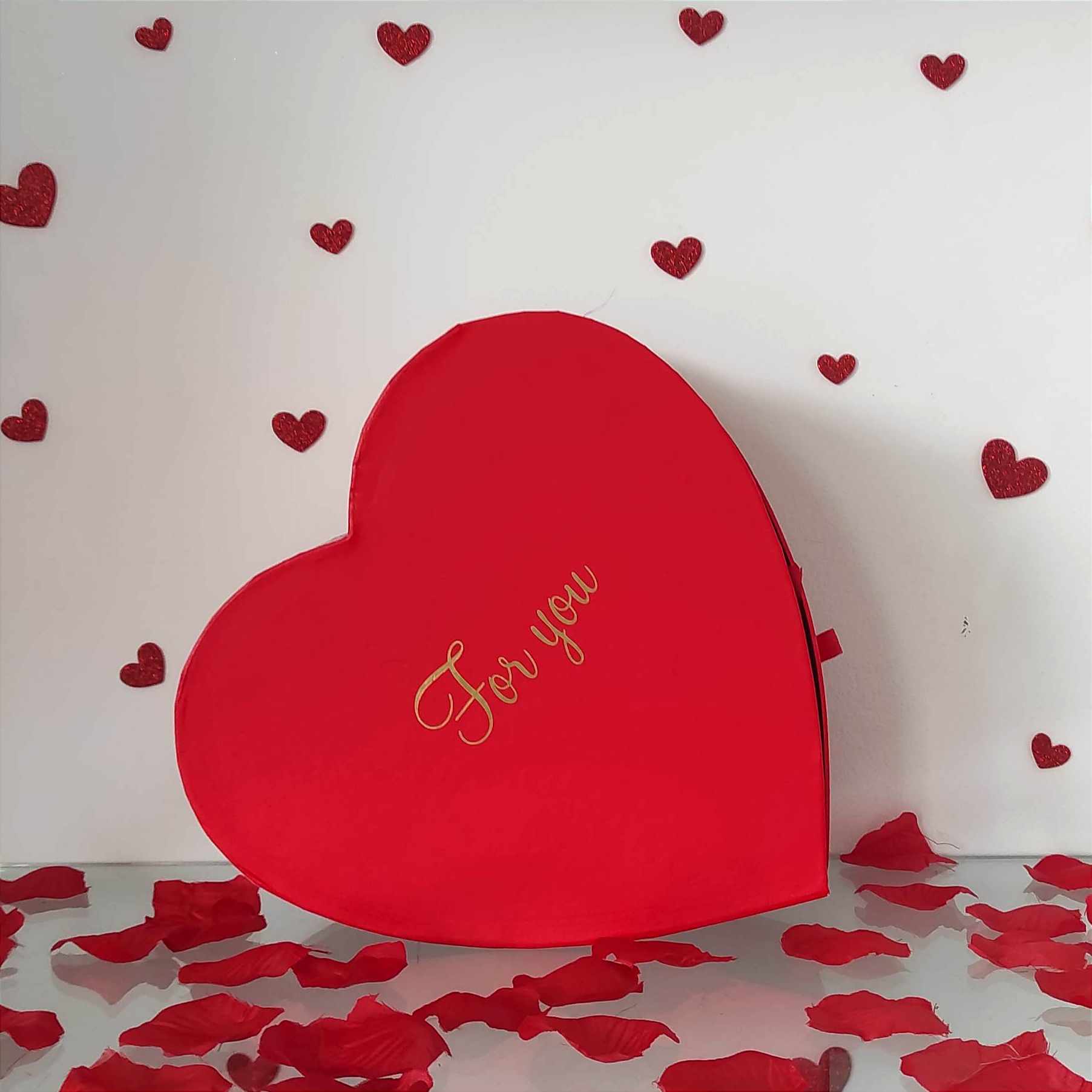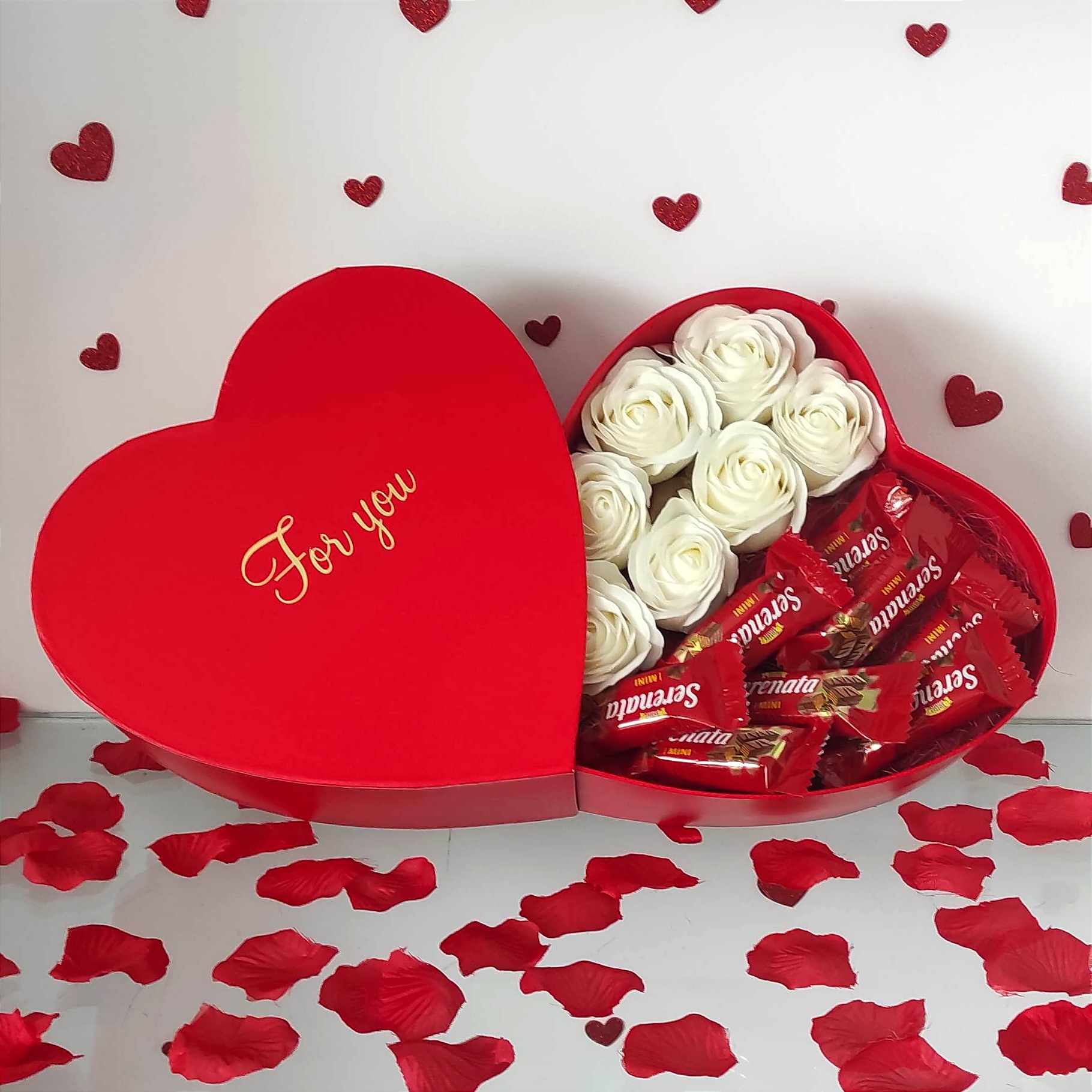 Κόκκινο κουτί καρδιά με εντυπωσιακά λευκά τριαντάφυλλα σαπουνιού (soap roses) και mini γκοφρέτες serenata.