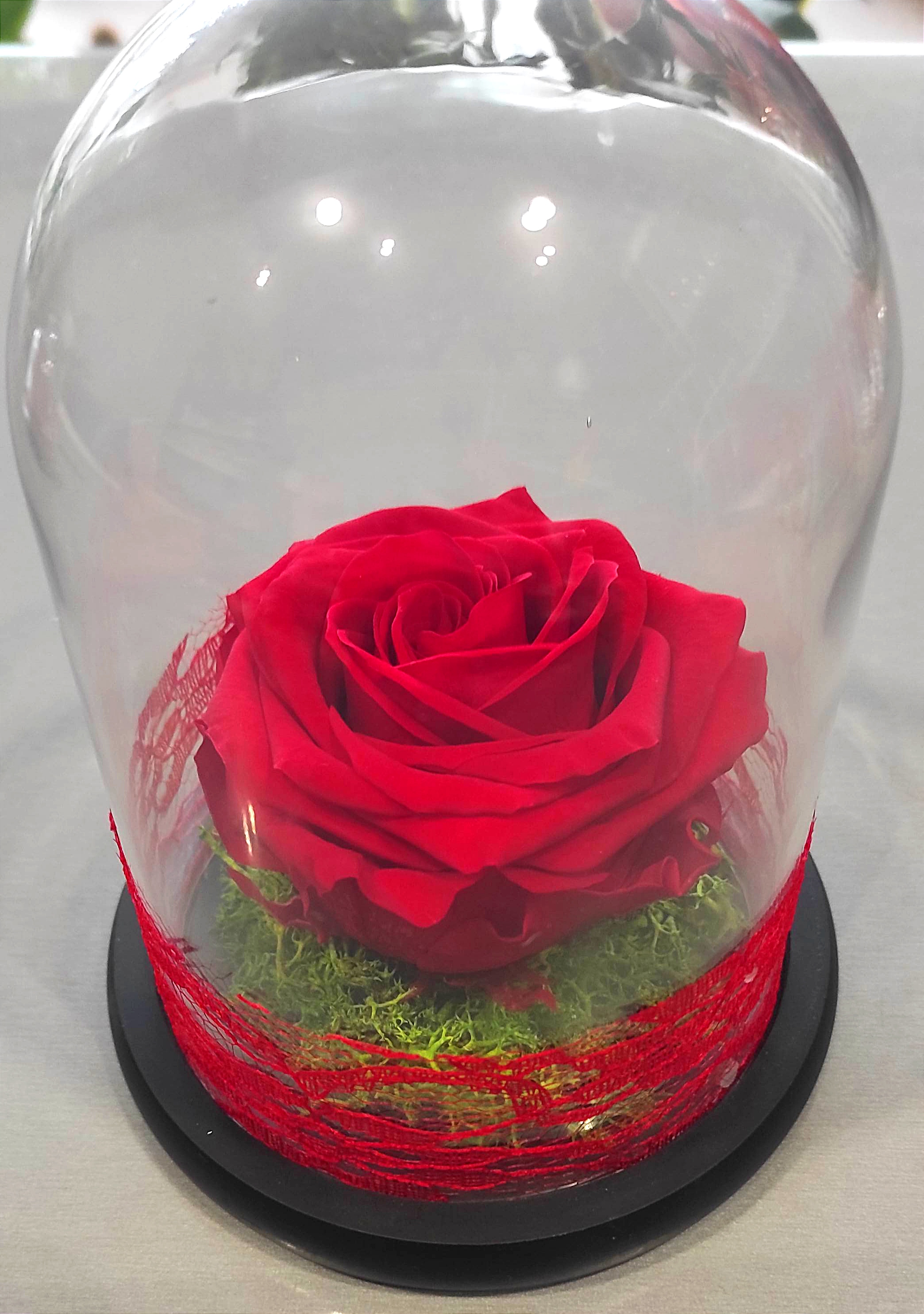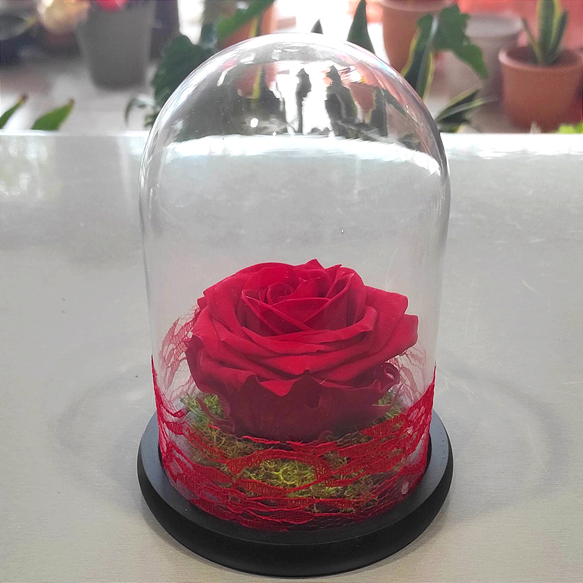 Αποχυμωμένο τριαντάφυλλο σε εντυπωσιακό κόκκινο χρώμα μέσα σε μεσαία γυάλινη καμπάνα 15cm.