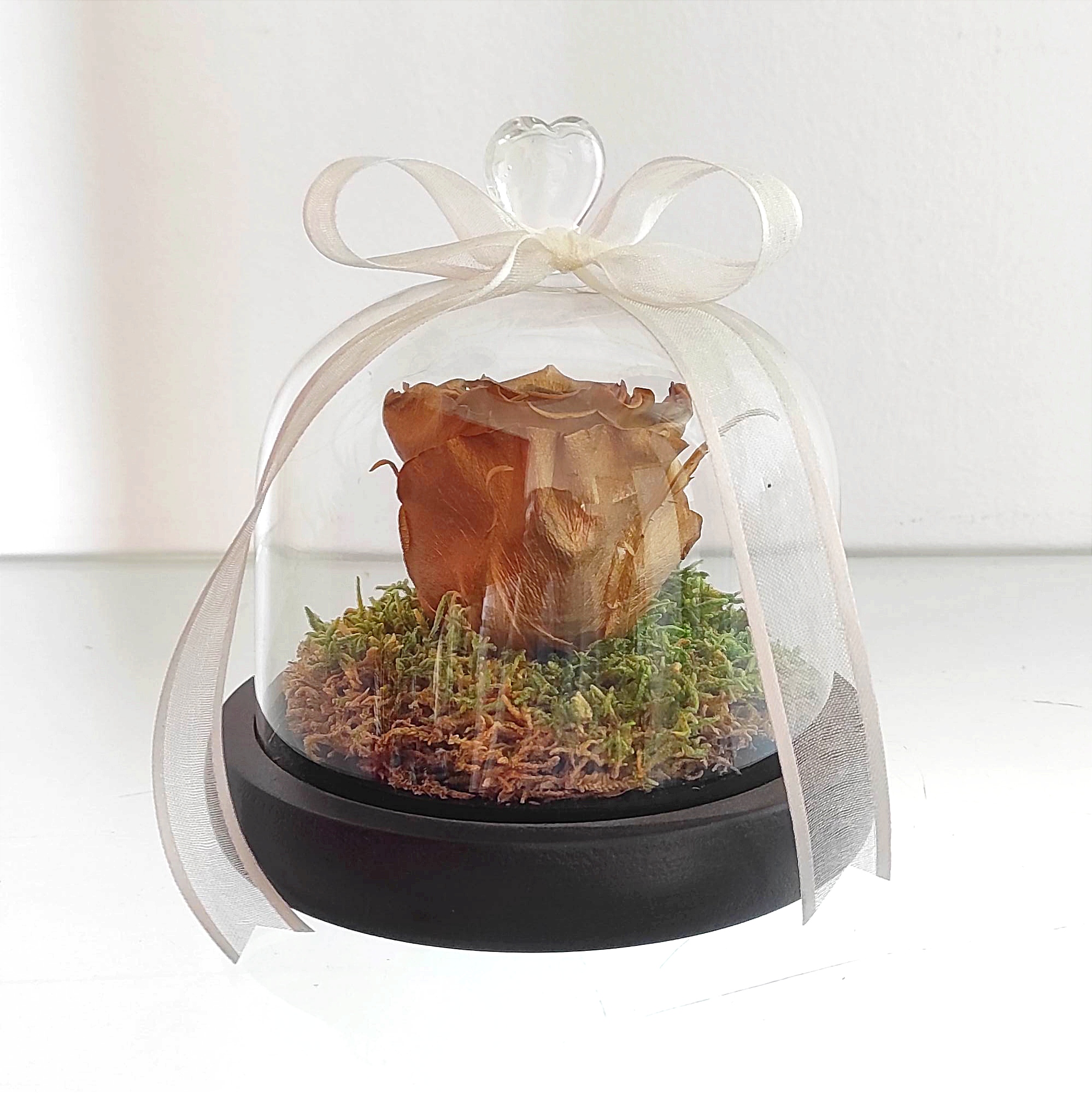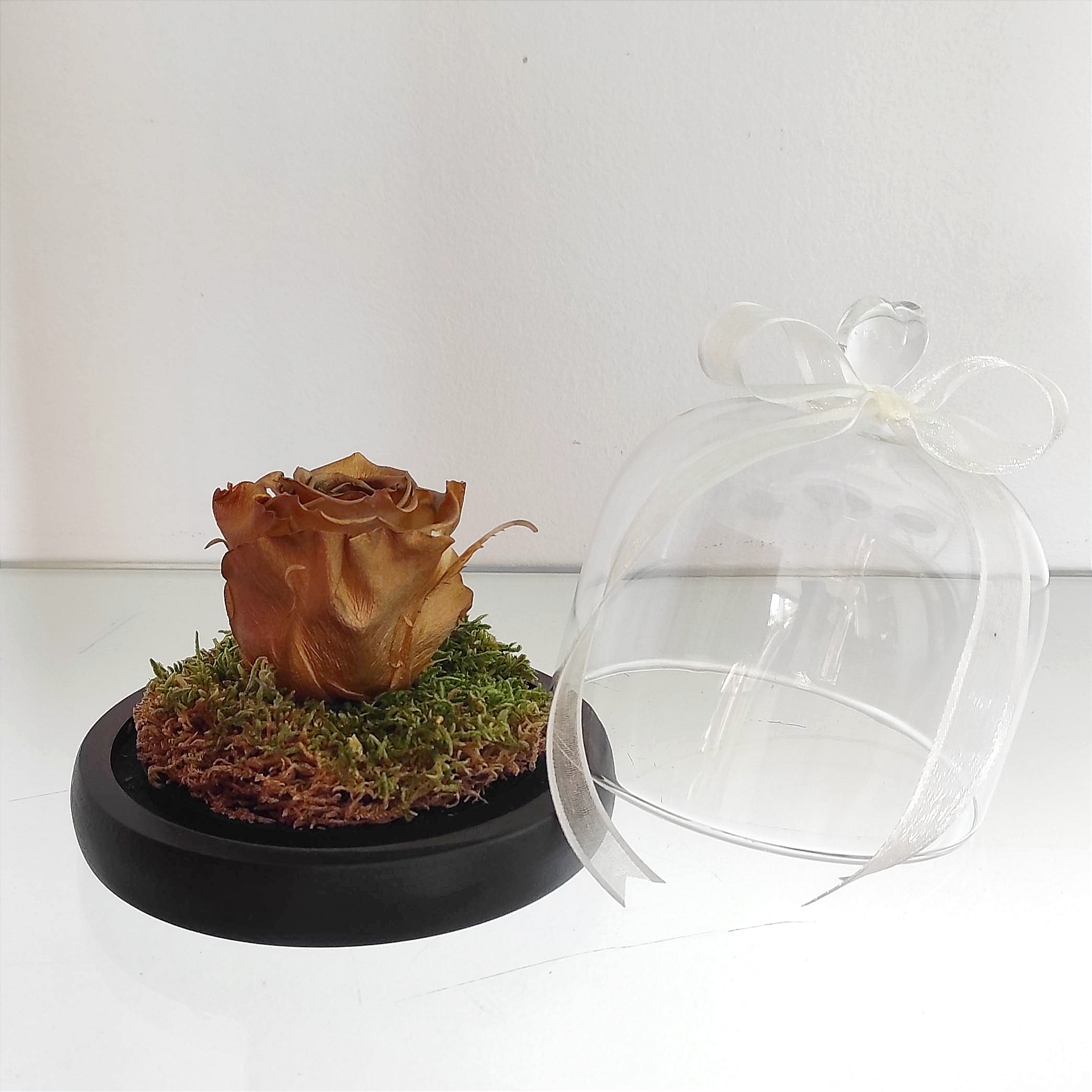 Αποχυμωμένο τριαντάφυλλο σε εντυπωσιακό χρυσό χρώμα μέσα σε γυάλινη καμπάνα με καρδιά.