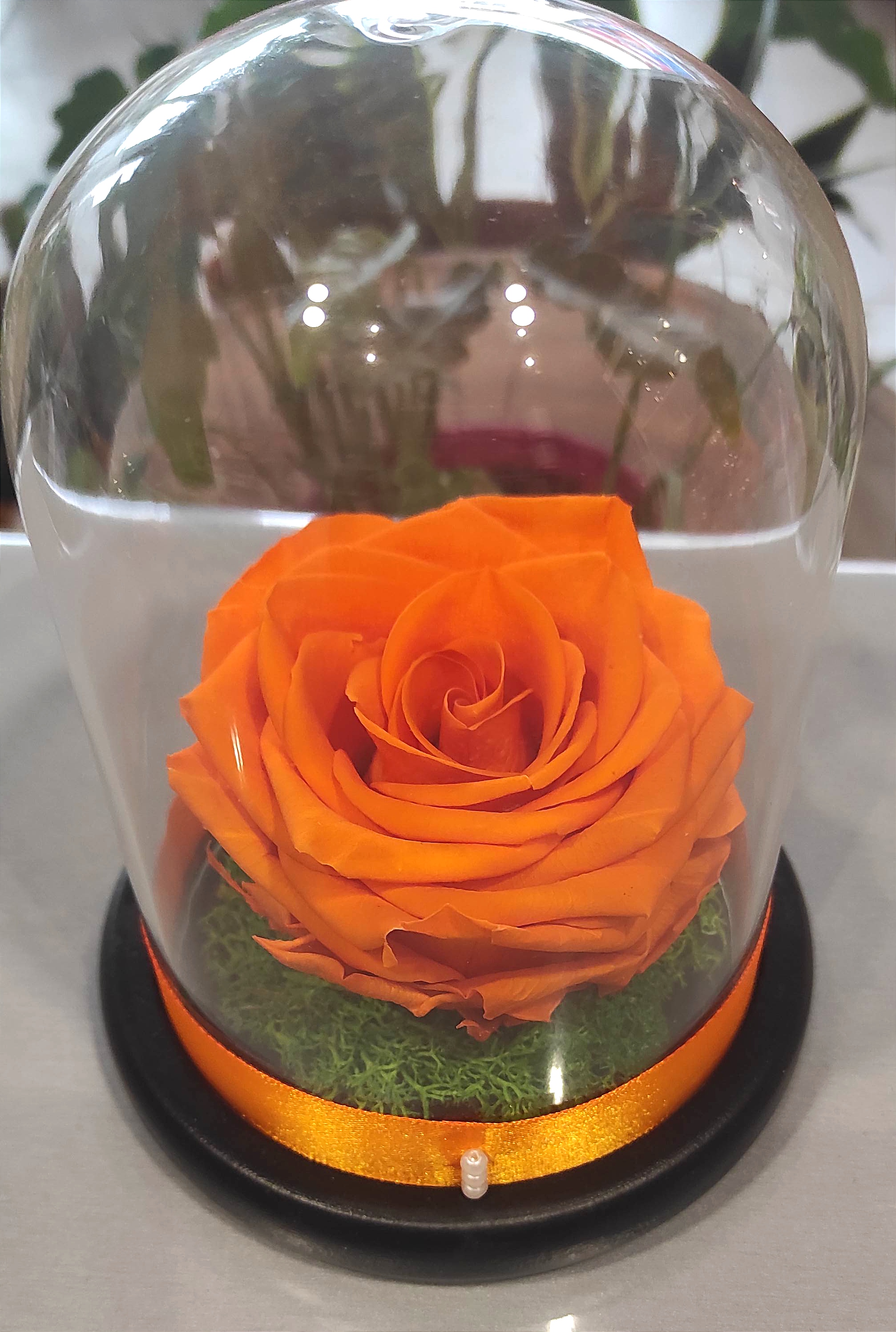 Αποχυμωμένο τριαντάφυλλο σε εντυπωσιακό πορτοκαλί χρώμα μέσα σε μεσαία γυάλινη καμπάνα 15cm.