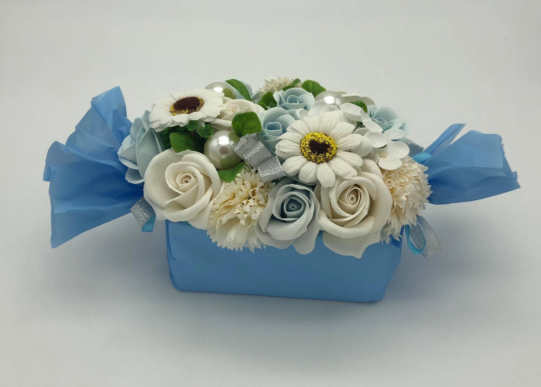 Σύνθεση από γαλάζια αρωματικά τριαντάφυλλα σαπουνιού - soap roses σε διάφανο κουτί συσκευασίας.