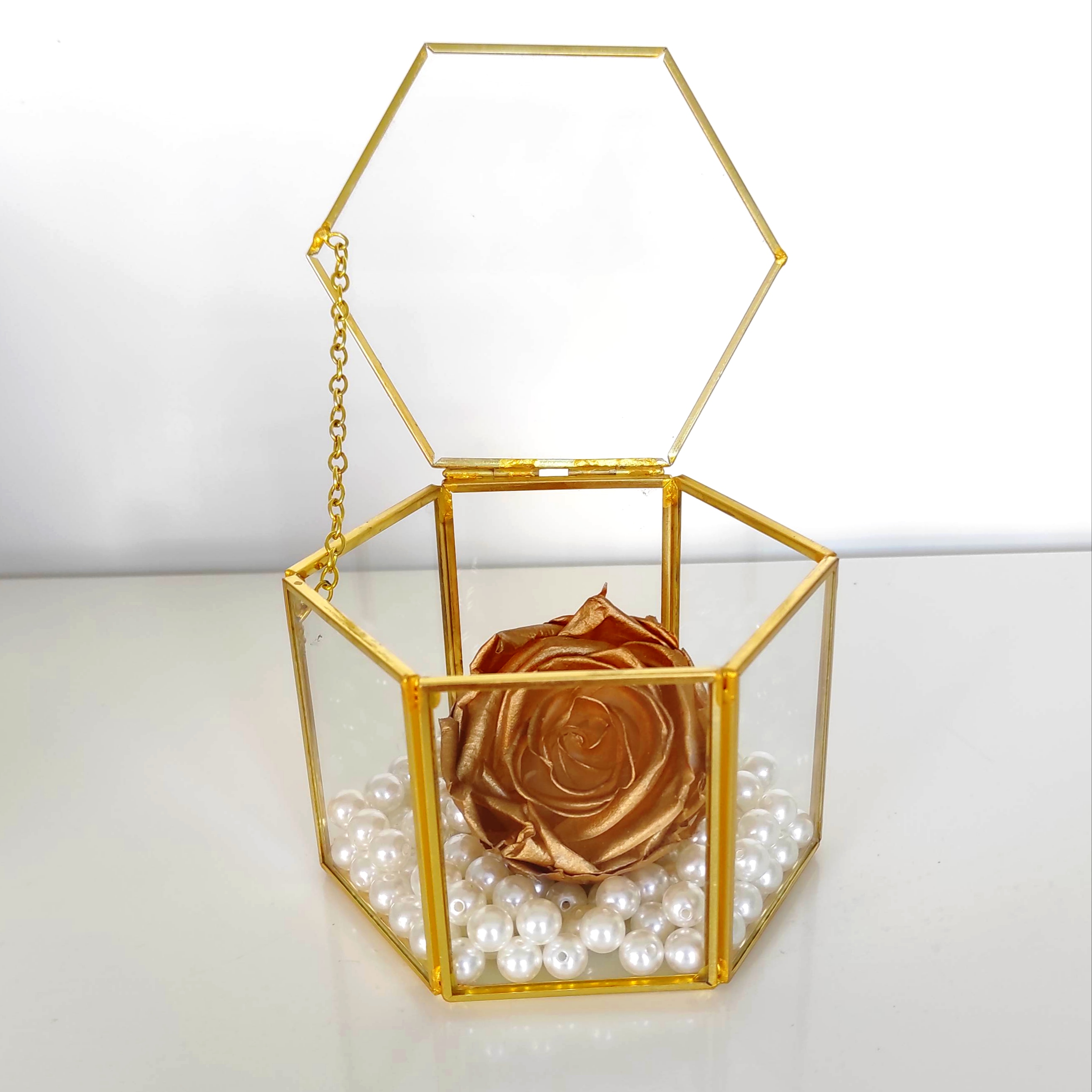 Forever rose σε εντυπωσιακό χρυσό χρώμα σε γυάλινο πολυγωνικό χρυσό κουτί με μεταλλικό σκελετό.