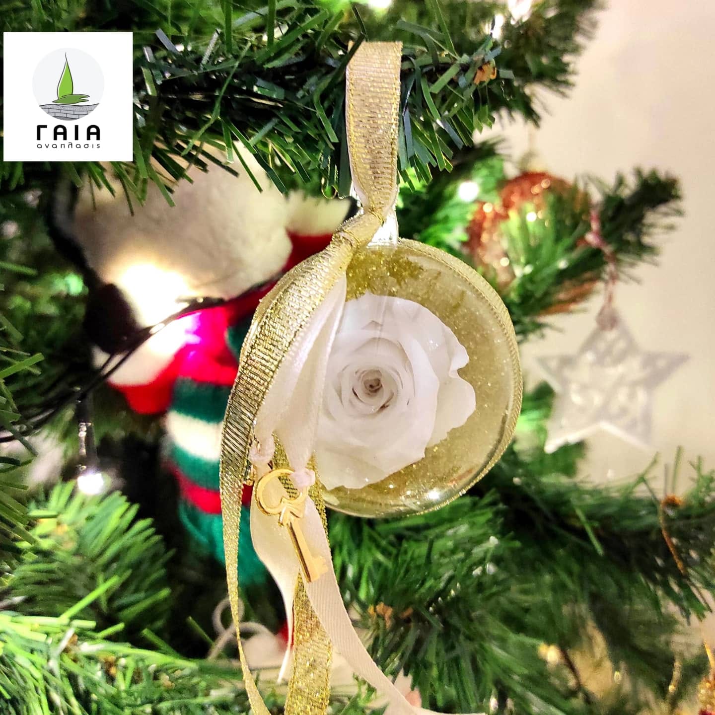 Χριστουγεννιάτικη μινι πλαστική μπάλα με λευκό forever rose και χρυσόσκονη!