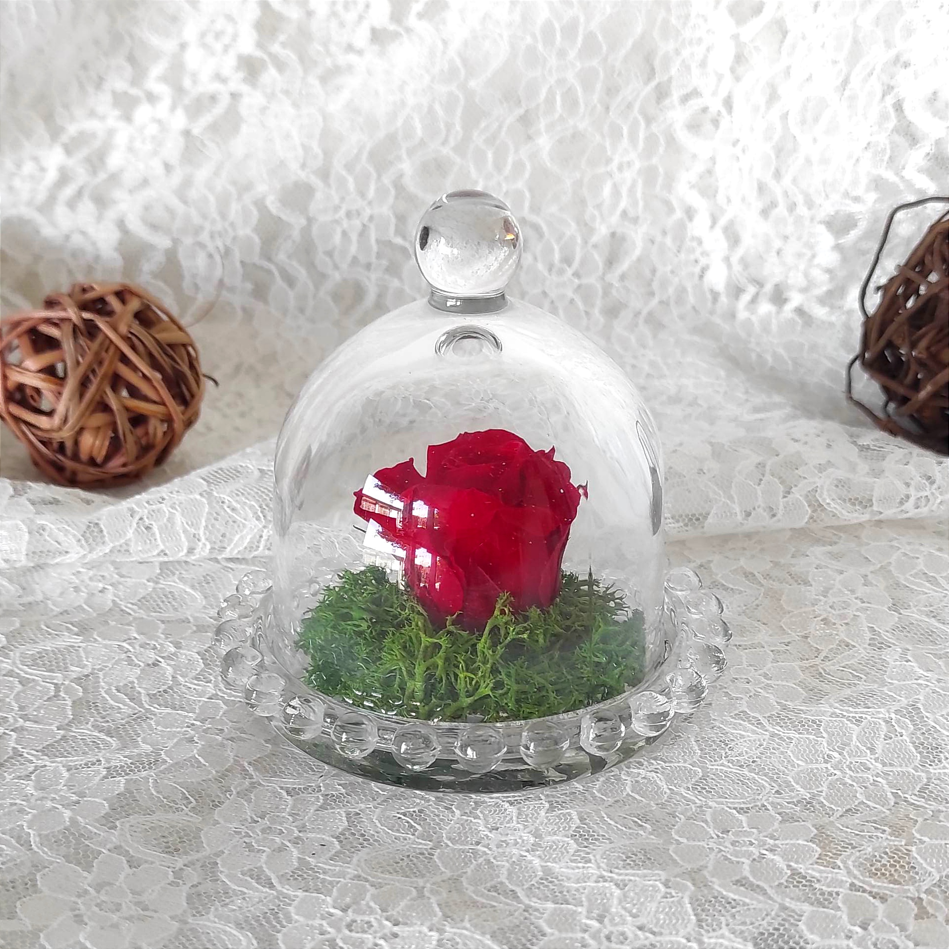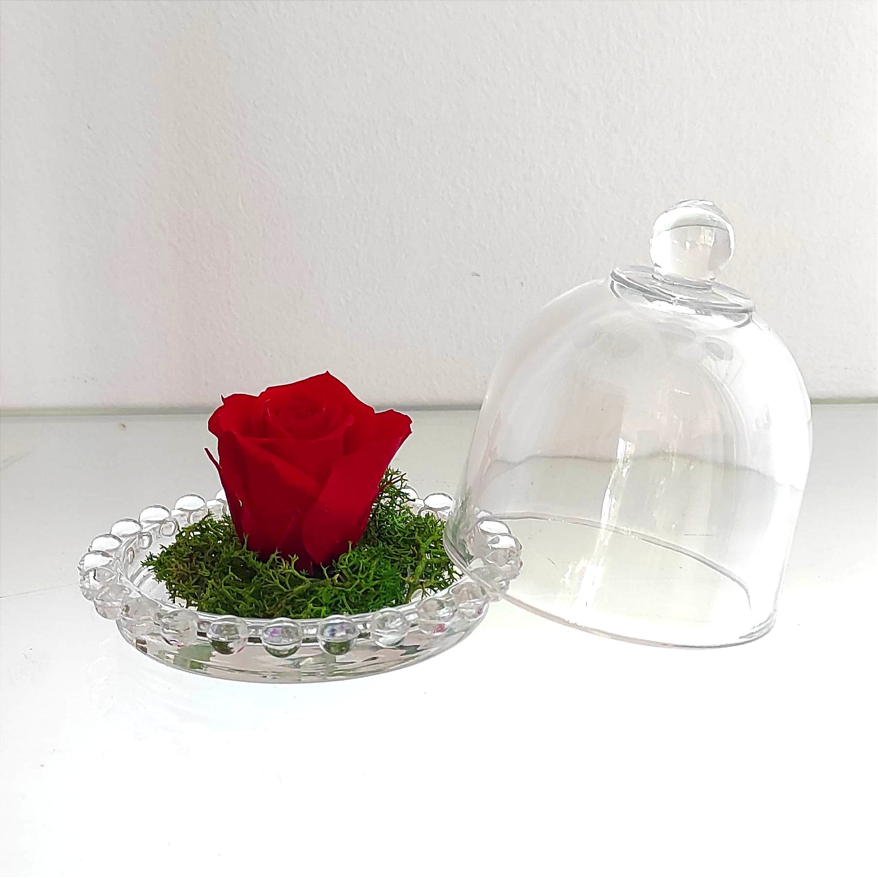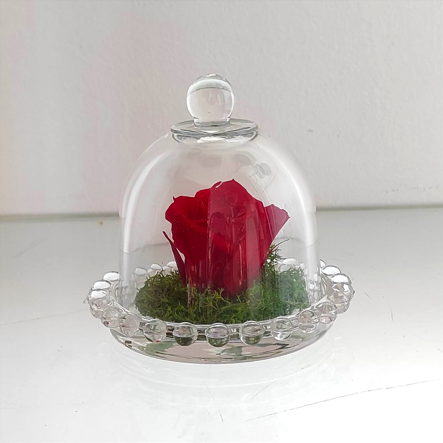 Αποχυμωμένο τριαντάφυλλο σε εντυπωσιακό κόκκινο χρώμα μέσα σε μικρή γυάλινη καμπάνα.