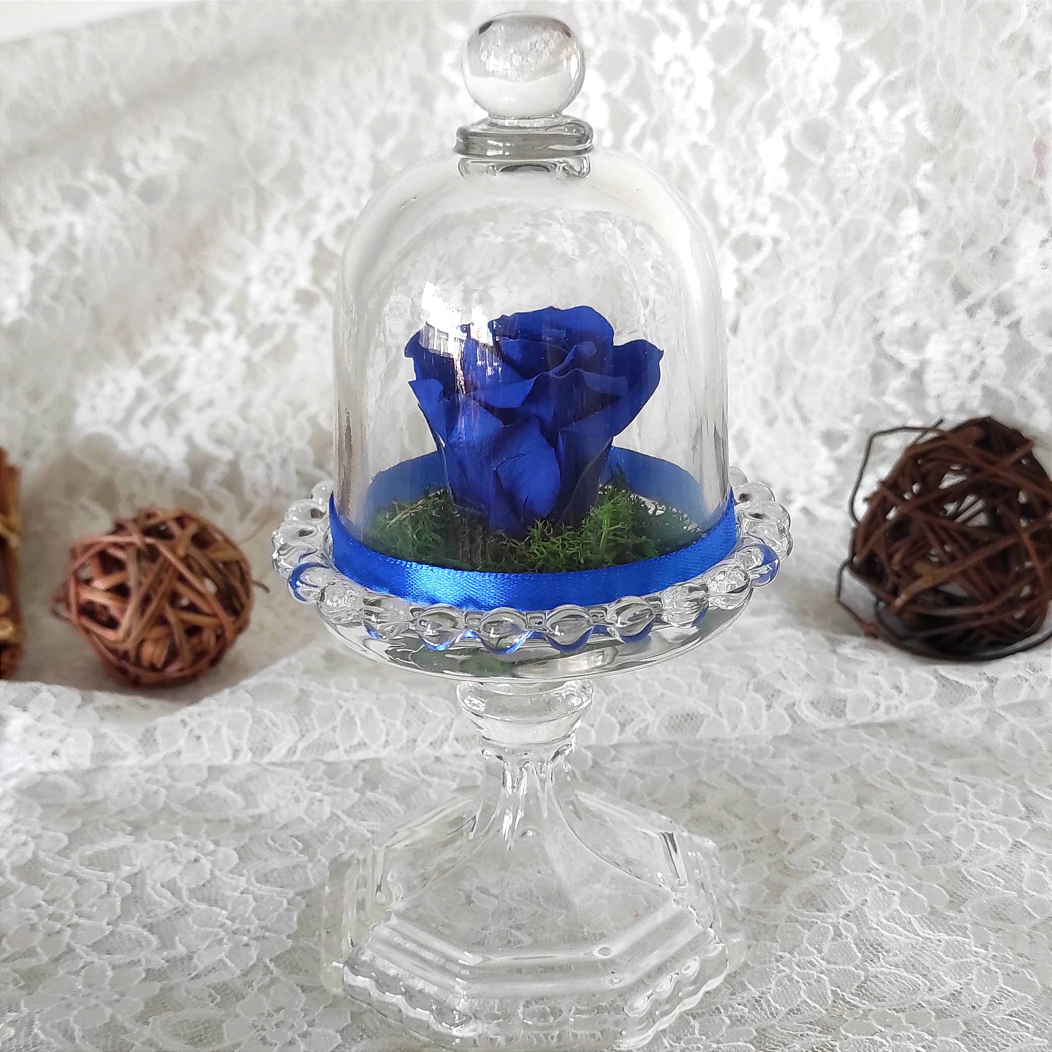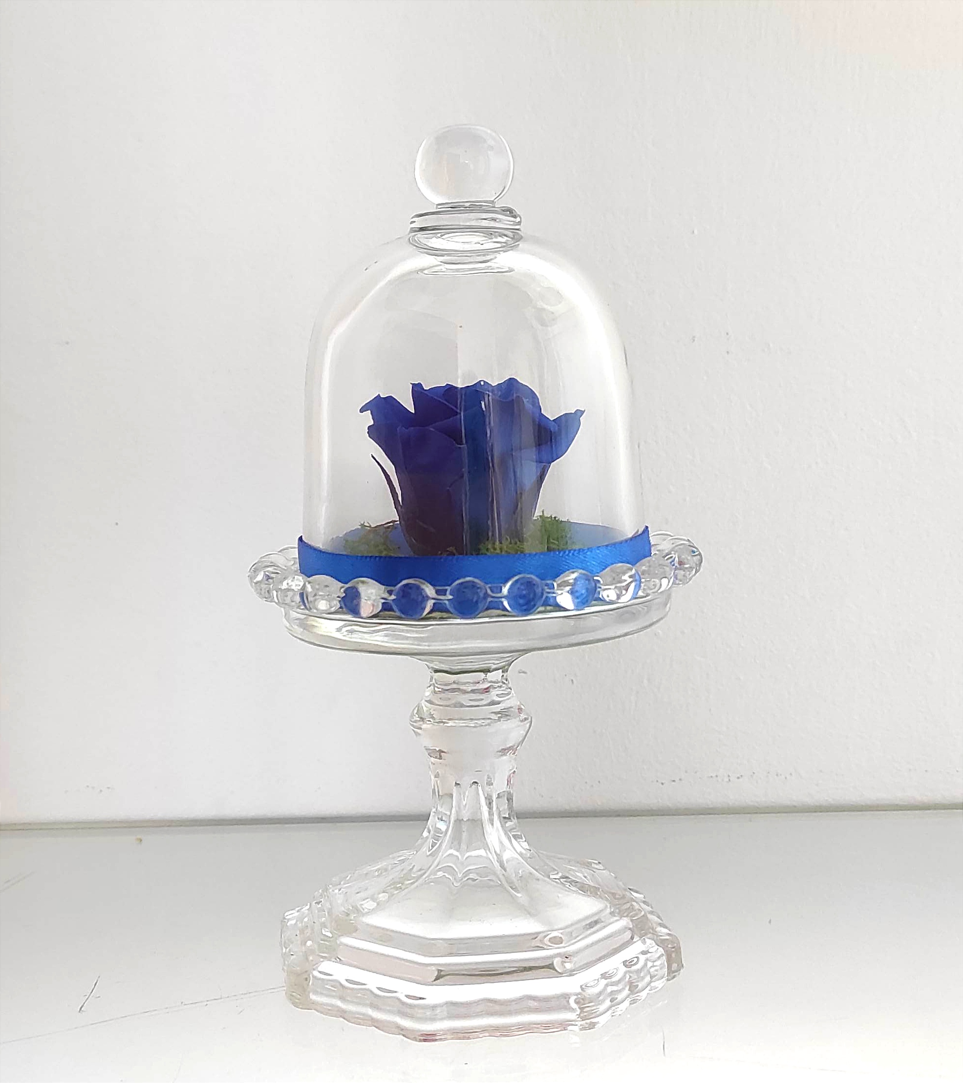 ποχυμωμένο τριαντάφυλλο σε εντυπωσιακό μπλε χρώμα μέσα σε μικρή γυάλινη καμπάνα με βάση.