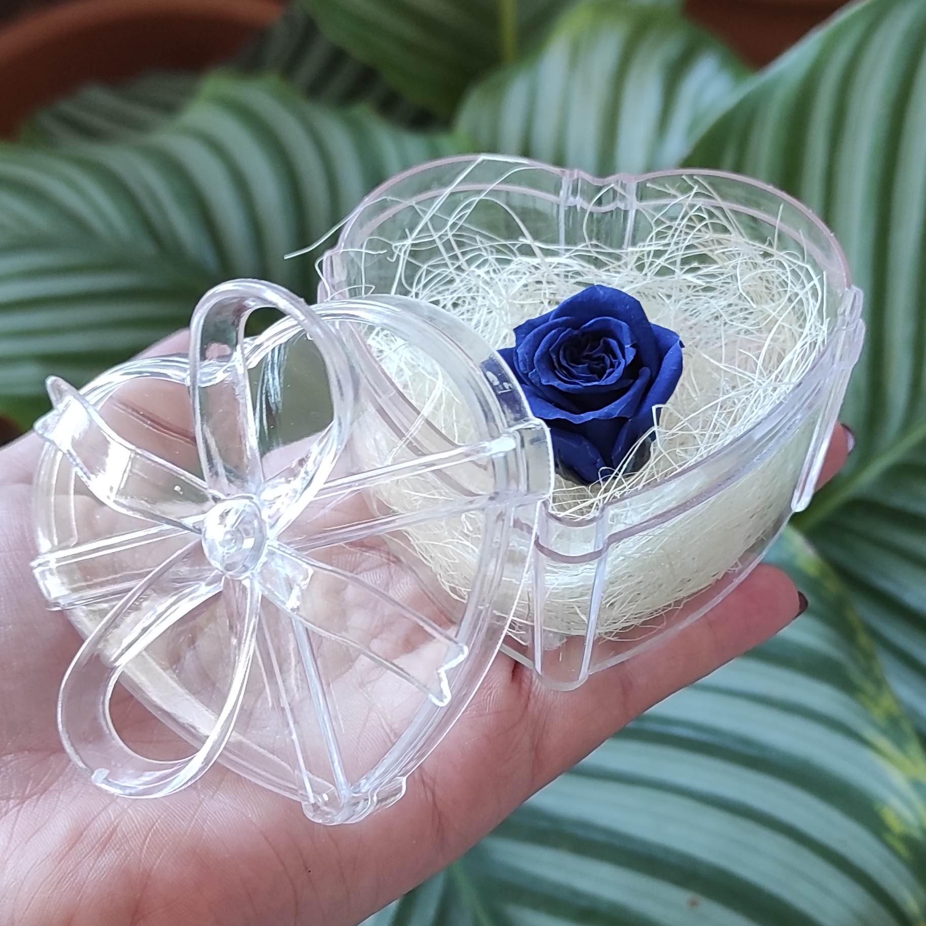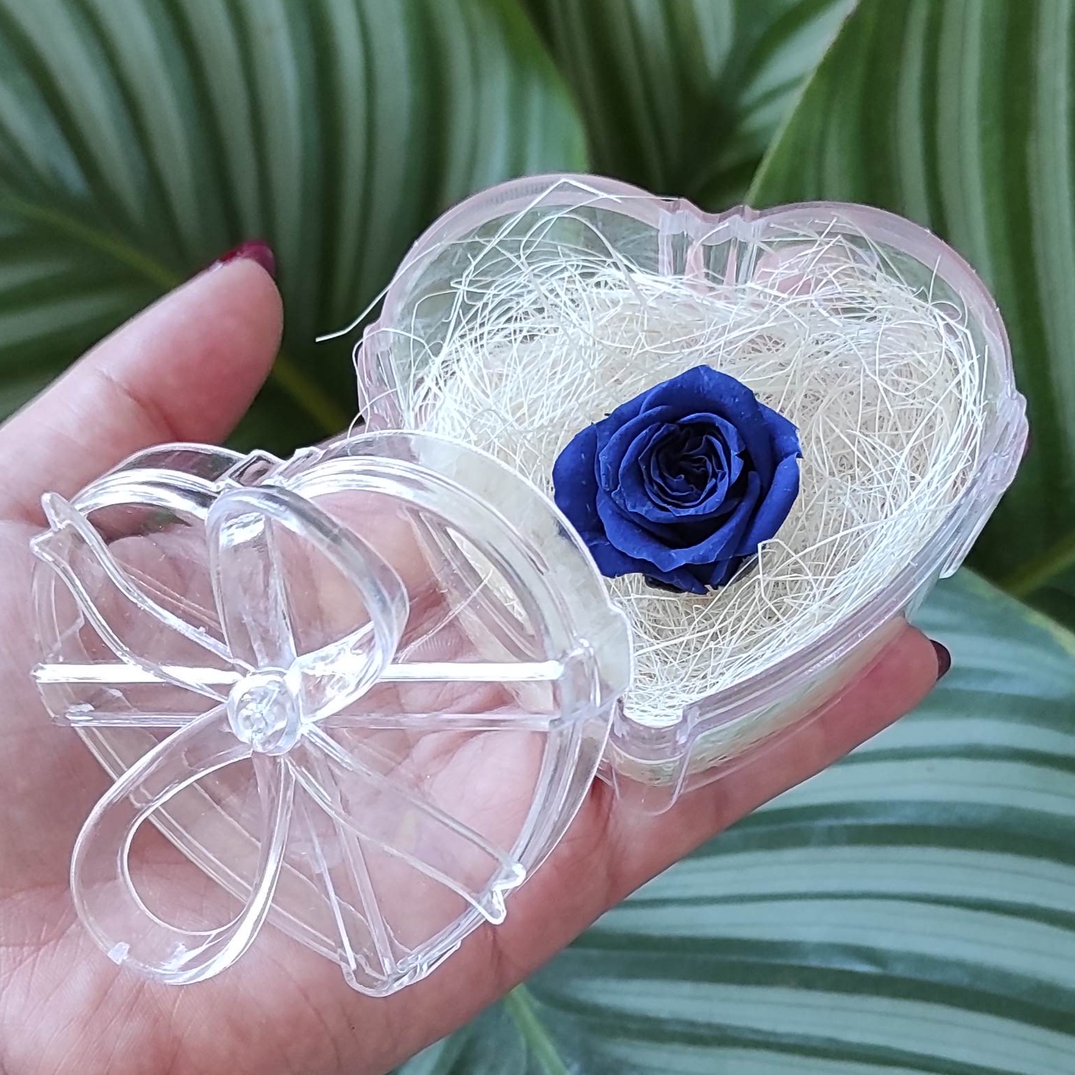 Mini μπλε forever rose σε πλαστική καρδιά με φιόγκο.