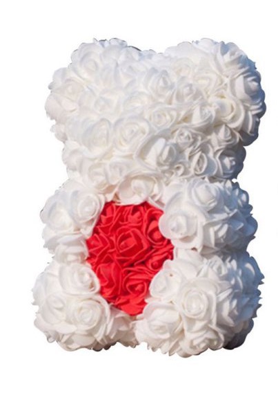 Αρκουδάκι από τεχνητά τριαντάφυλλα 25 cm σε λευκό χρώμα με κόκκινη καρδιά.